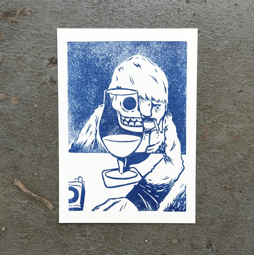 Mein Linolschnitt „Bierchen“ als Riso-Postkarte, bei Interesse einfach melden.